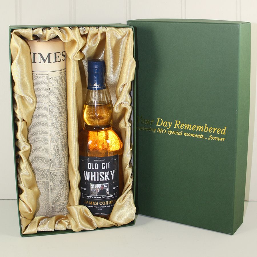 An extra special gift, comprising of a bottle of Glen Moray Single Malt Whisky along with a newspaper from the past. Personalise the label with your message!