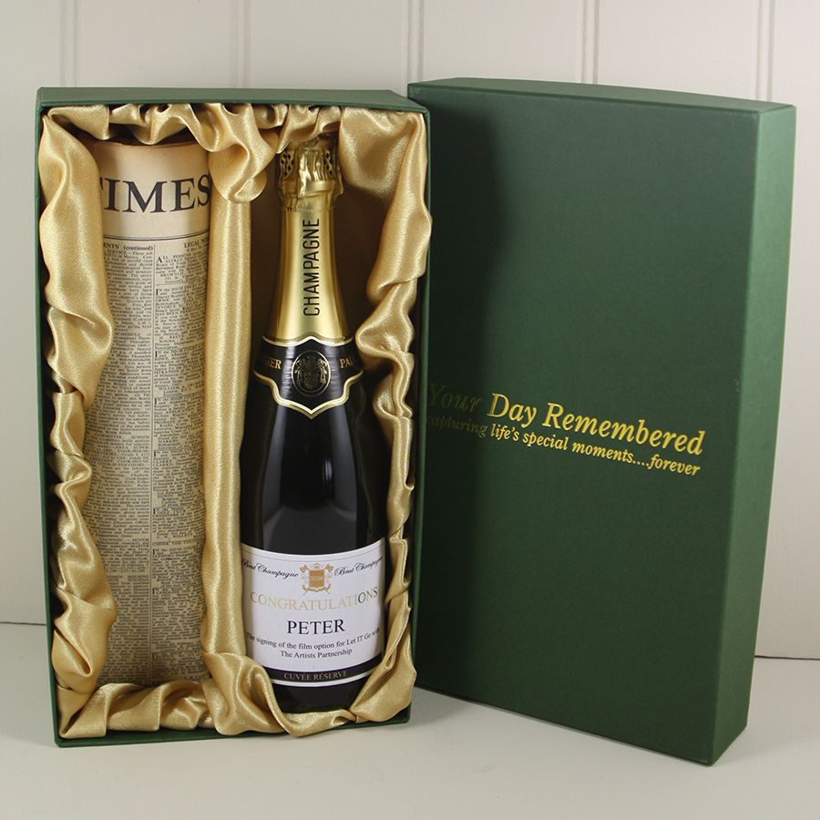 An extra special gift, comprising of a bottle of Paul Langier champagne along with a newspaper from the past. Personalise the wine label with your message!